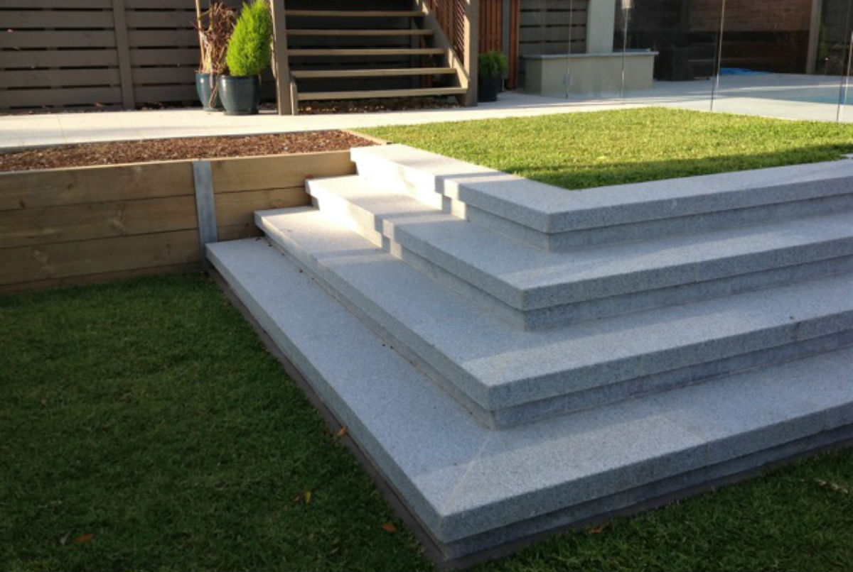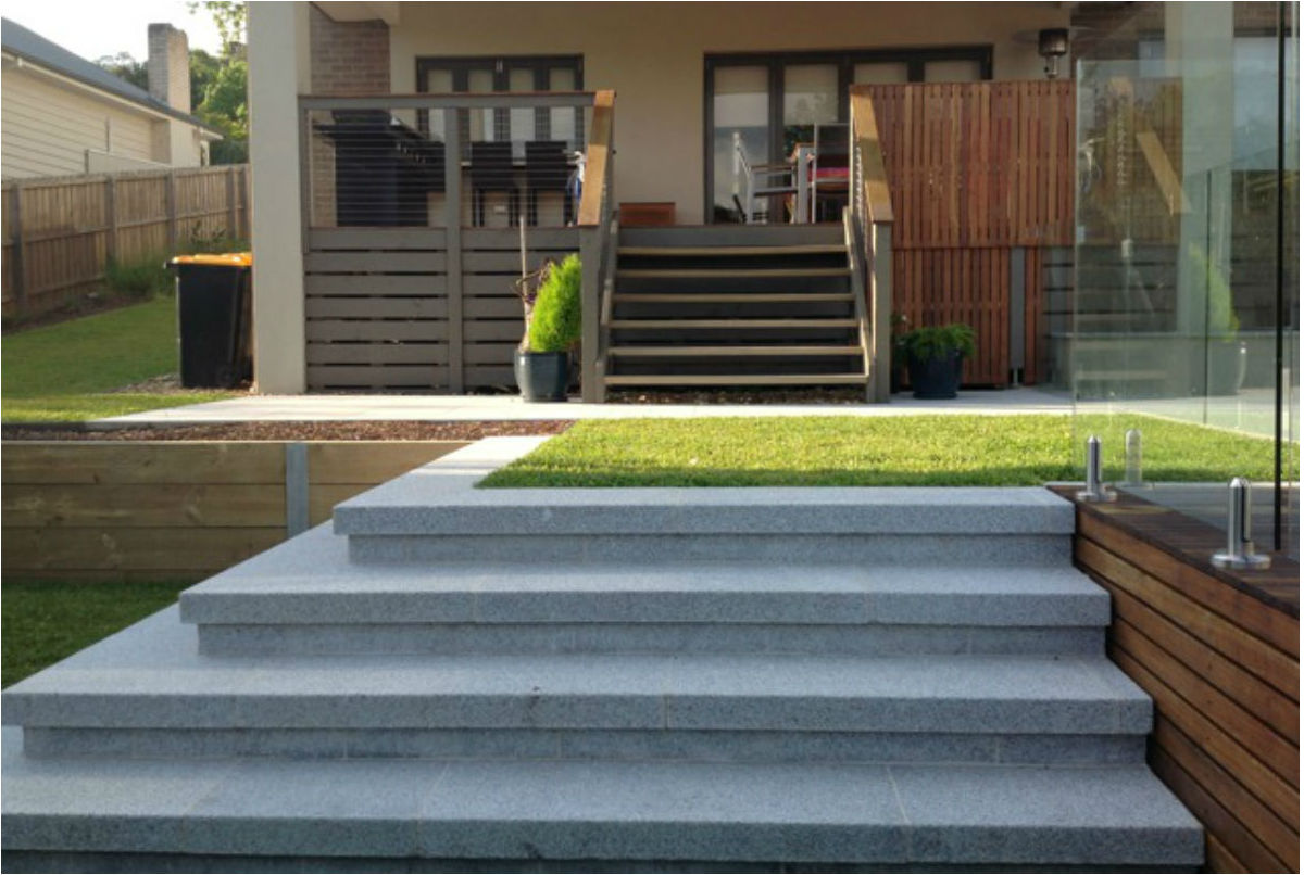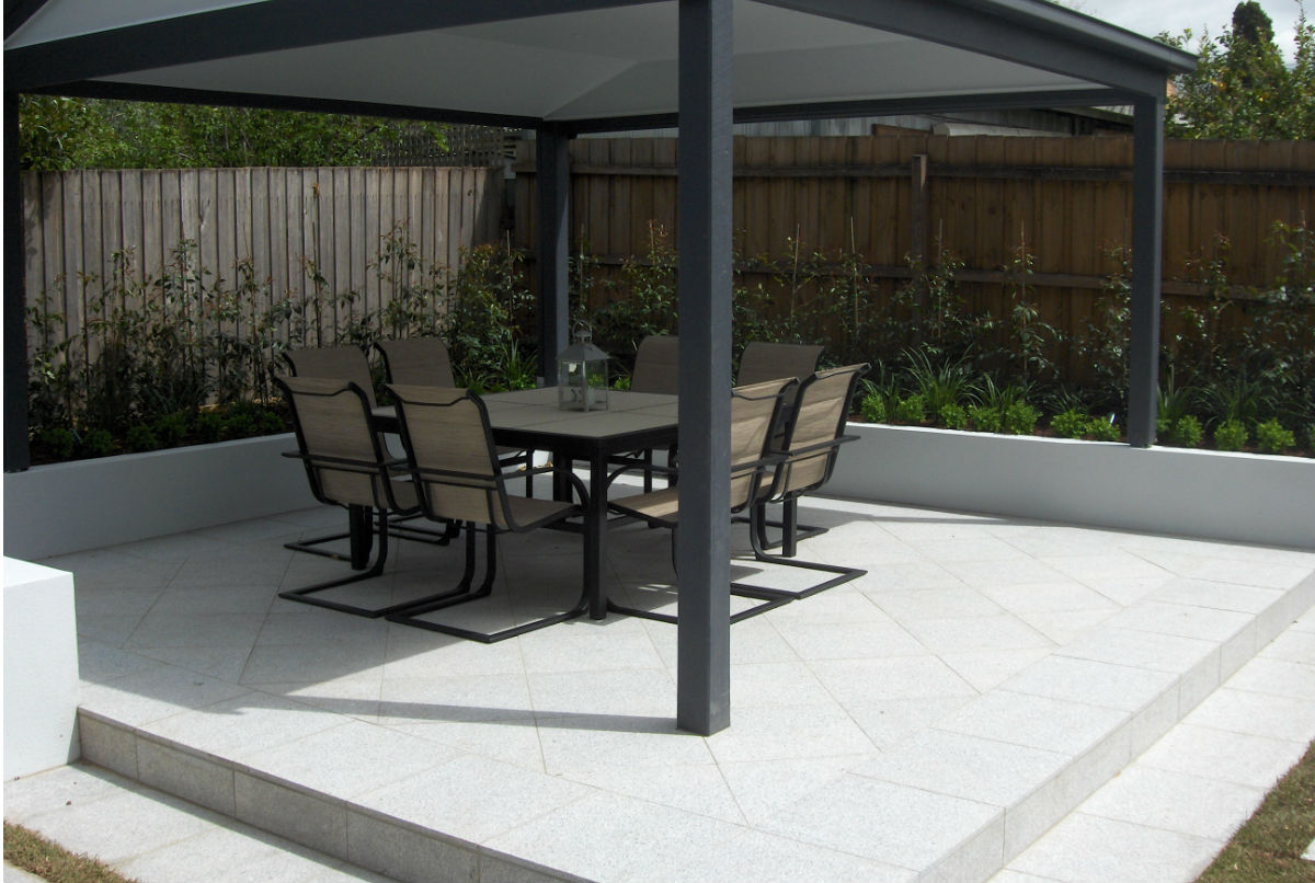 Alpine Granite has a white background colour with a subtle black fleck to lend a natural look and reduce glare. Alpine Granite is available with an exfoliated (flamed) finish; sandblasted and bush hammered finishes are available as a custom order as are custom sizes.