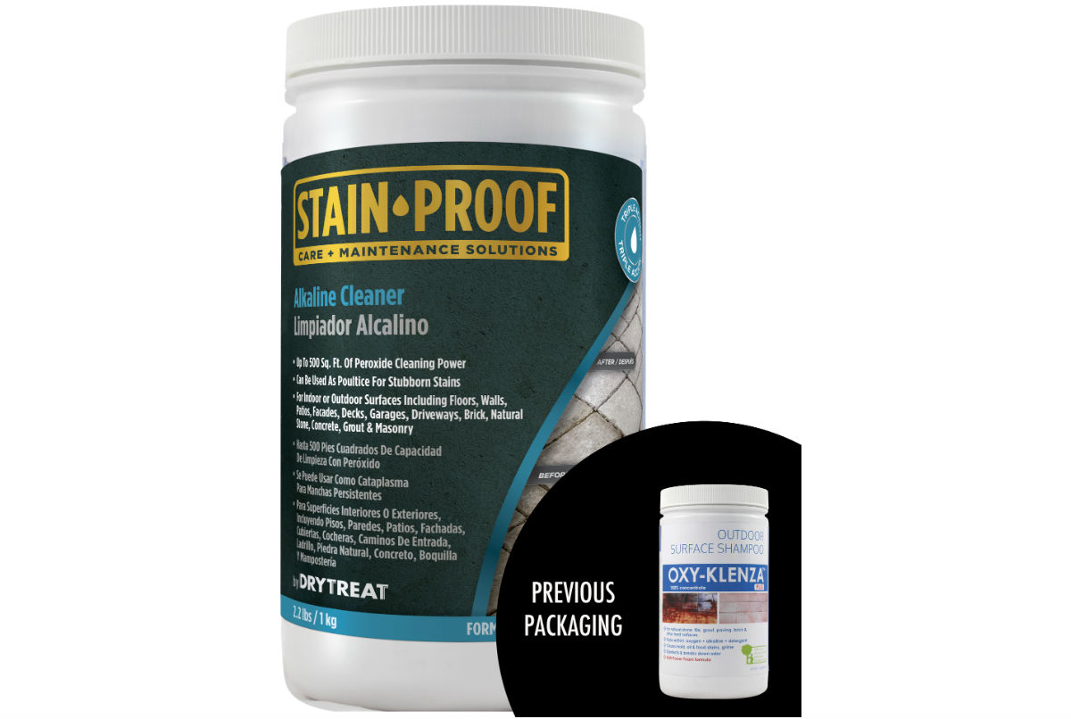 Stain Proof Alkaline Cleaner (Oxy-Klenza) is an odorless, powerful triple action, oxygen, alkaline and detergent boosted heavy duty cleaner for removal of general grime and stains caused by oil / grease, mold, leaf marks, food and beverages. Safe for all natural stone, tile, masonry, concrete, brick, grout, vinyl and raw /unfinished wood. Stain Proof Alkaline Cleane is 100% concentrate, environmentally responsible and safer to use than traditional heavy duty cleaners.