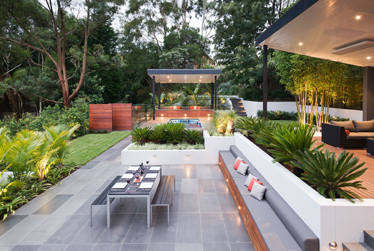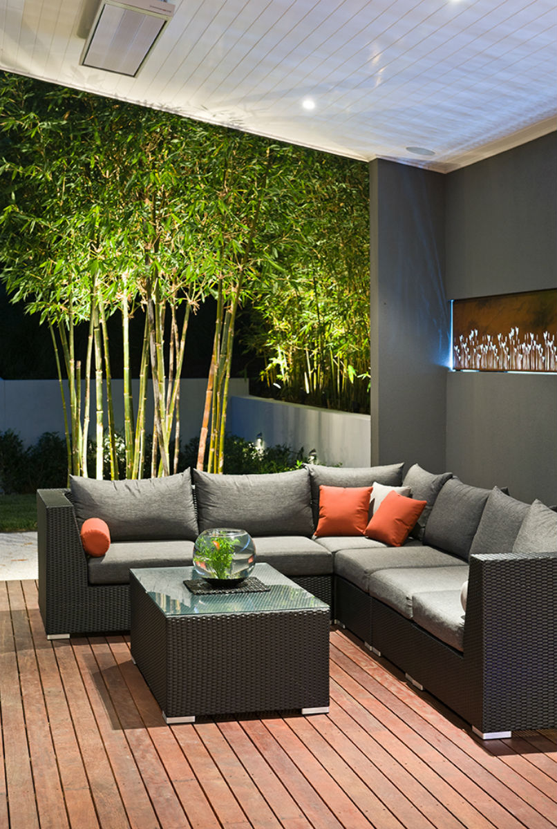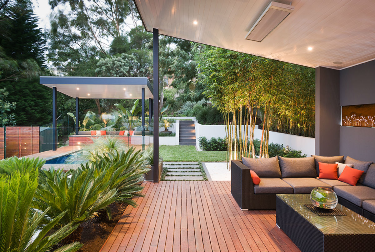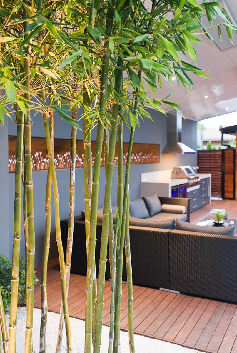 A fully appointed alfresco kitchen is the hero of this articulate design, featuring a double bar fridge, four burner barbecue, and sink, as well as a stainless steel range-hood. With down lighting installed in each of the pavilions, cooking, dining and entertaining is effortless at any time of the day or night. The inclusion of a large Hamii Bamboo creates a notable feature to one end of the deck with its stripped stems, while low profile outdoor sofas allow for maximum comfort.