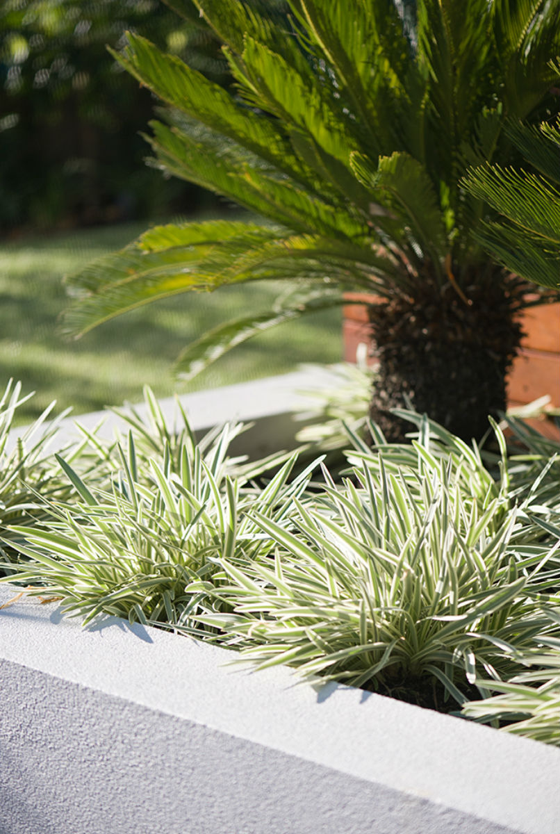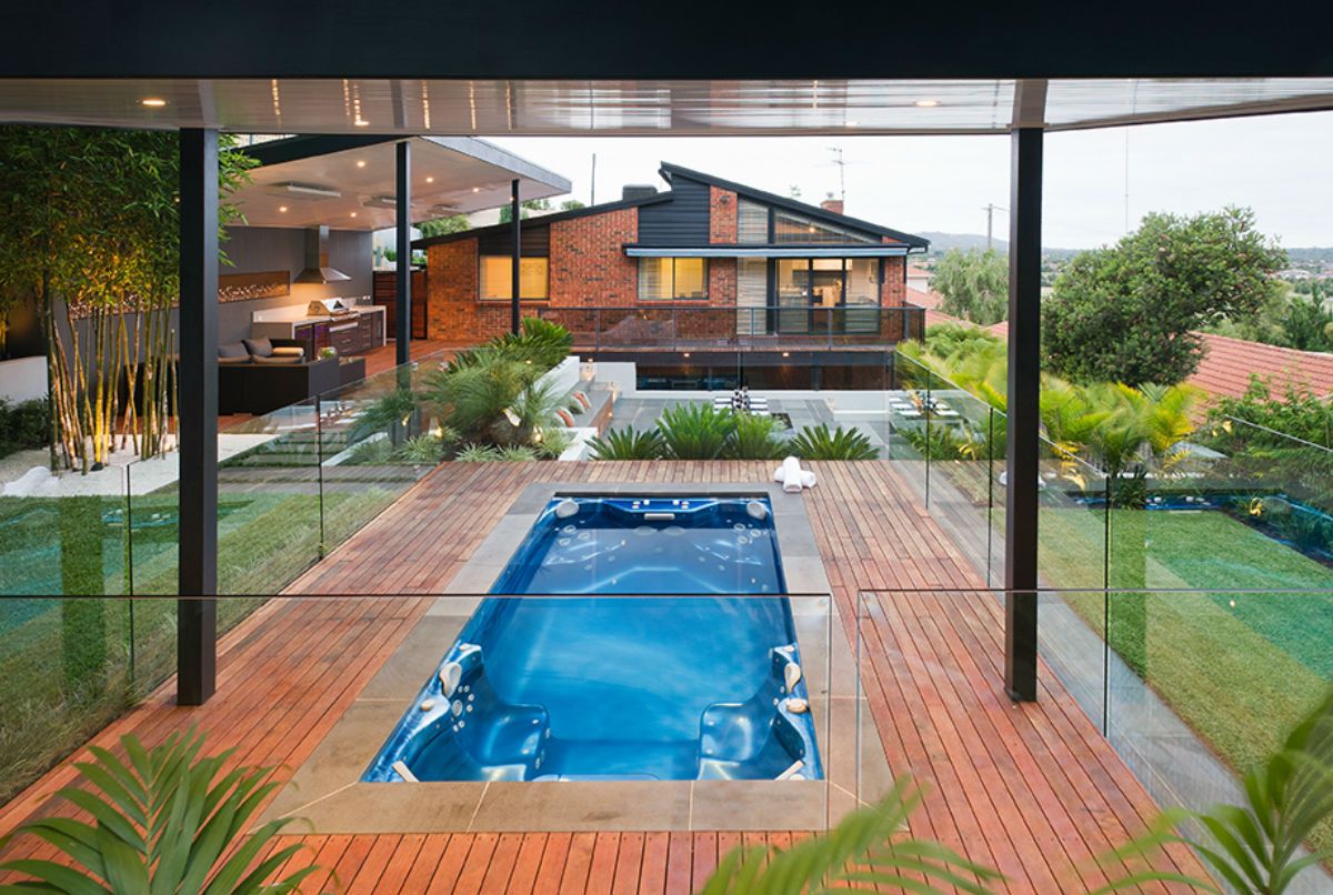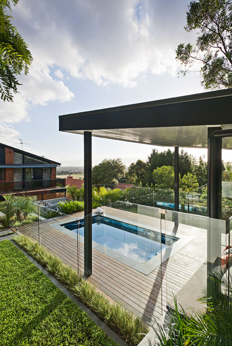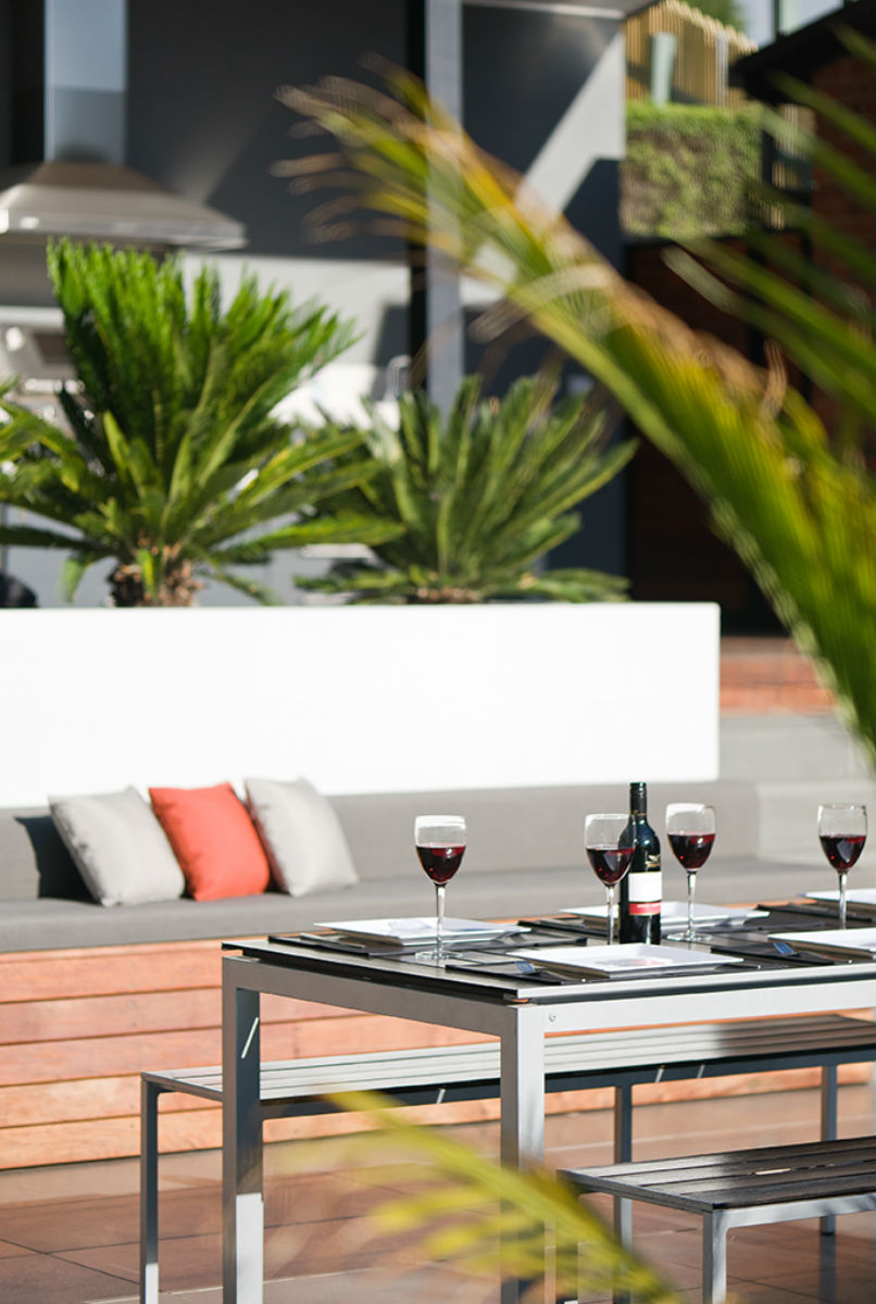 Following the Cycads, which flank the edge of the raised alfresco kitchen area, guests are led onto the first section of lawn where the kids are able to play while the adults watch on from the second pavilion a little further on. Here, a padded bench seat sits at the head of a large and inviting spa.