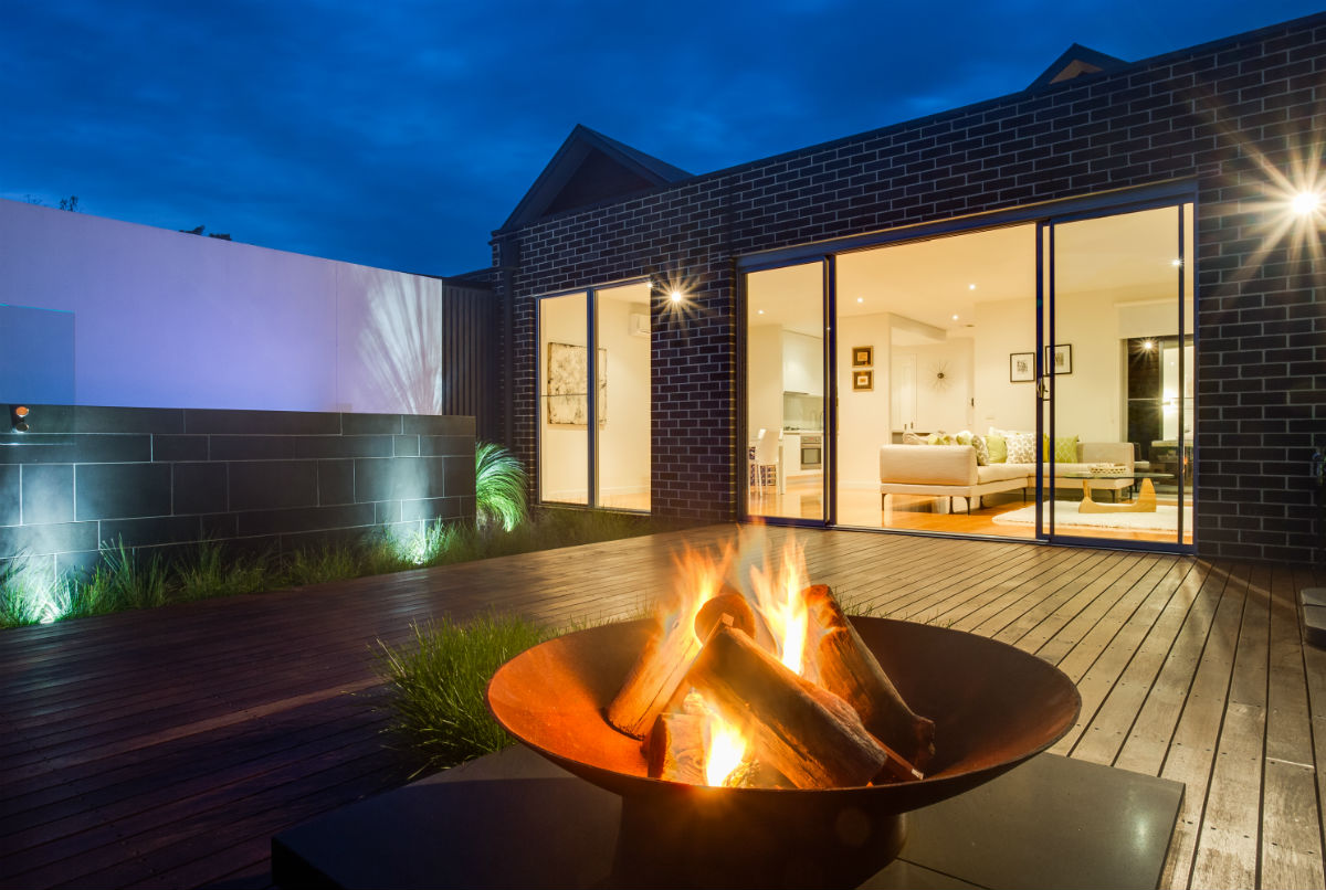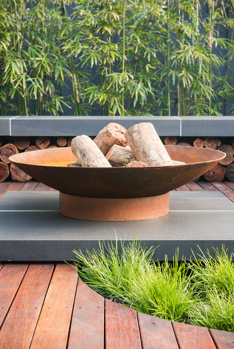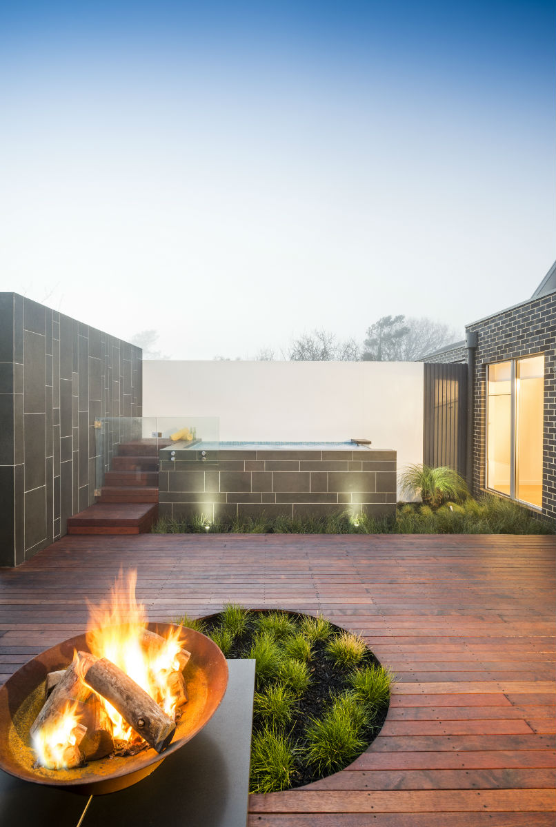 Stone Hub supplied Bluestone Honed custom made spa coping, seats, a fireplace base, a feature wall and spa cladding for this stylish and functional outdoor entertaining area located on the Mornington Peninsula.