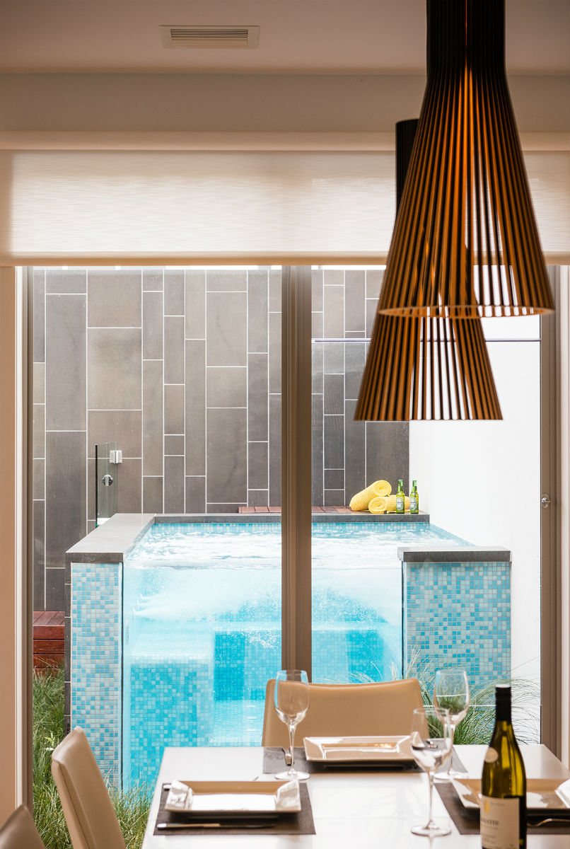 Aqua Mosaic “Pacific” colour pool tiles, which were used in the spa, were a standout feature material.