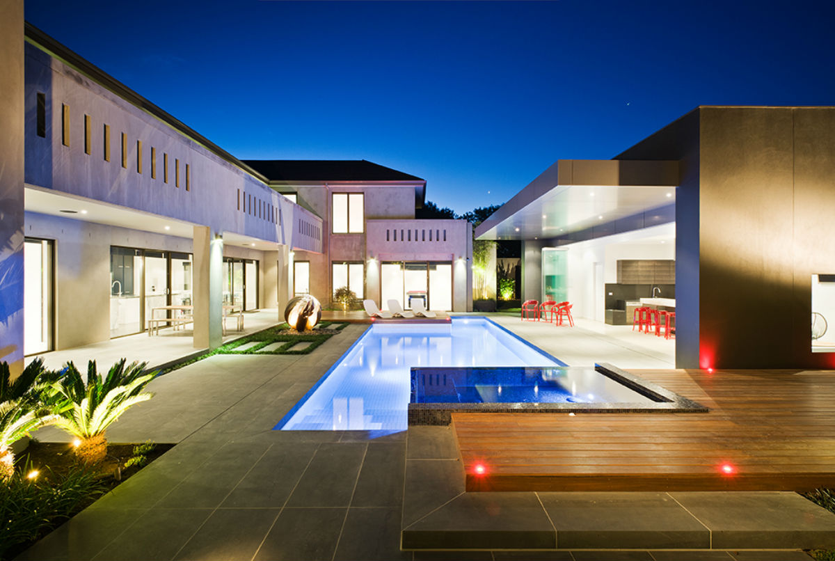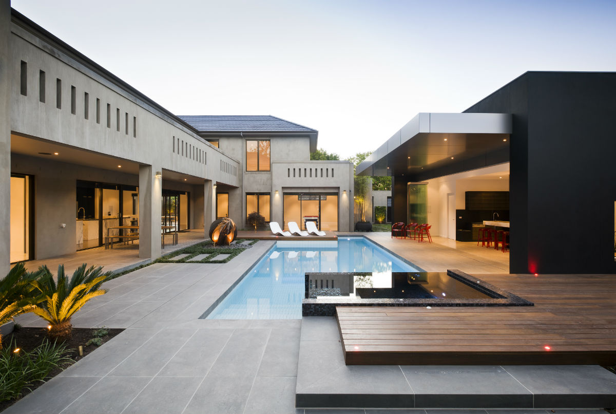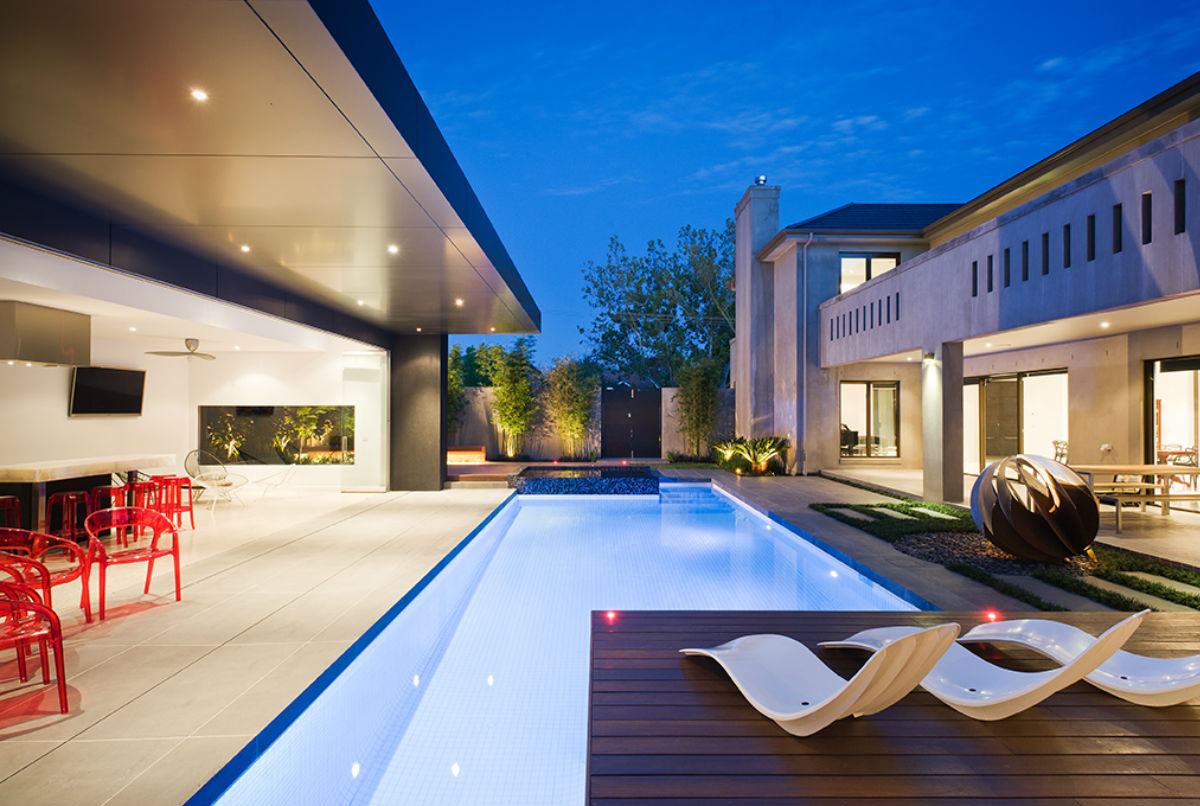 Project was designed by Steve Taylor, Director COS Design, the clean, crisp landscape features sleek uncluttered lines and a restrained modern palette of colours and materials. The result is a series of open and airy spaces and a seamless interior-exterior transition.The materials used are of the highest quality and include custom-sized honed bluestone paving with drop-down coping and feature bluestone cobbles, all of which were supplied by Stone Hub. Bluestone is an enduring stone with impressive slip and scratch resistance, making it ideal for around pools and entertaining areas.