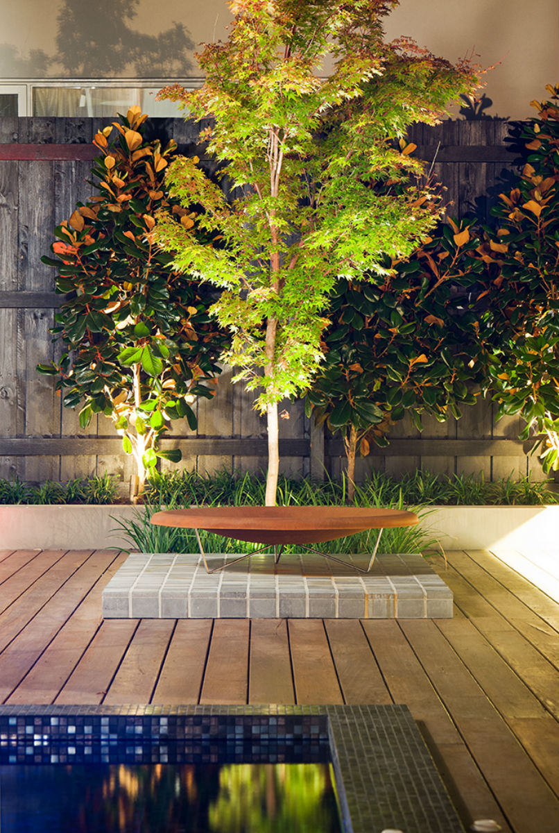 Every element within each outdoor space was chosen – and positioned – with great care. The Sphere sculpture from Lump Sculpture Studio, a contemporary creation of Corten and stainless steel, sits where it can be enjoyed from the pool house or when looking out from inside the home. Equal care was taken to make optimum use of the space in the parents’ courtyard, from the “floating” cantilevered timber bench to the Lump 3D Sahara water wall, also from Lump.