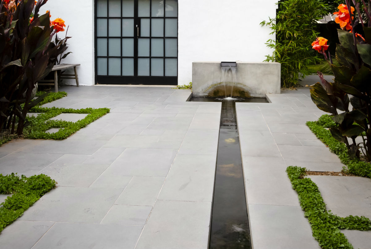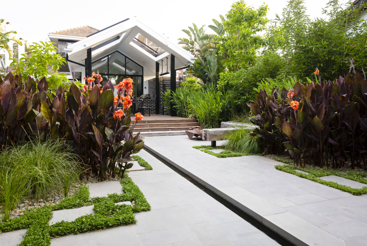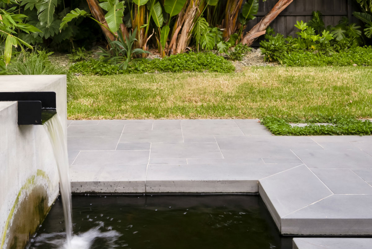 This garden in the Melbourne suburb of Ripponlea was designed by Lisa Ellis Gardens.  The striking foliage, coupled with Stone Hub’s Graphite Sawn Bluestone hardscaping, showcased the architecture of the property and created various zones with a lush resort style feel.  This included a striking water rill cutting through the backyard.