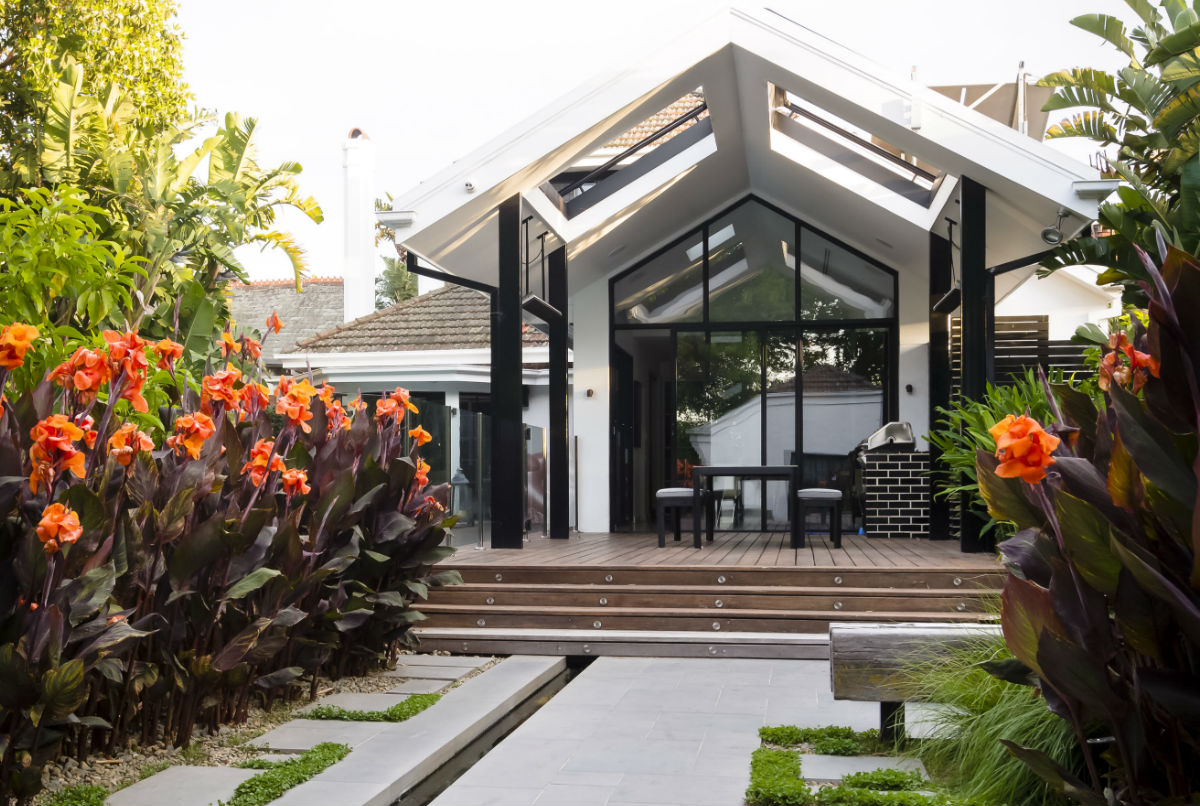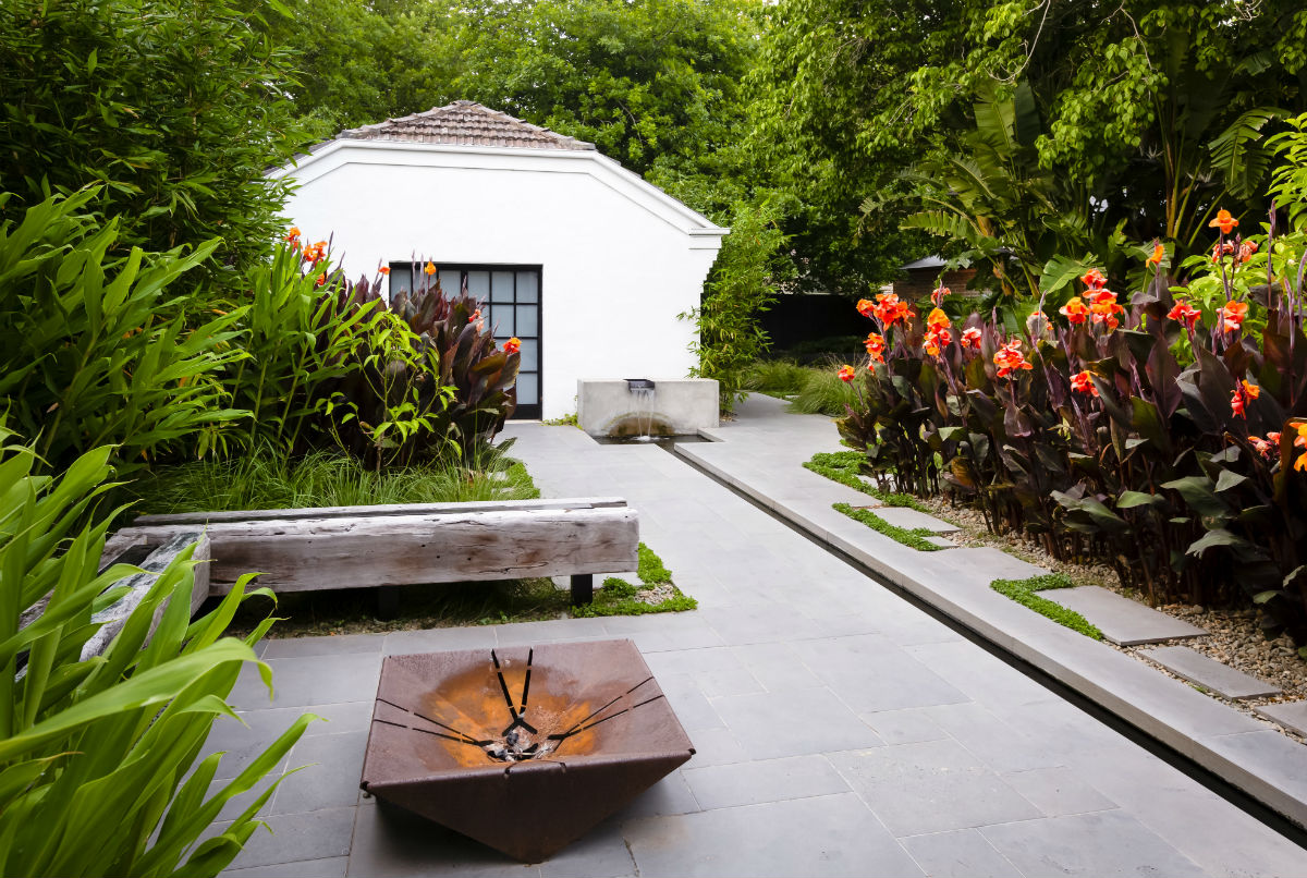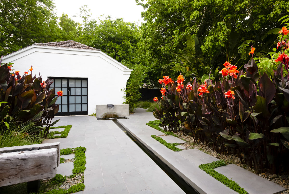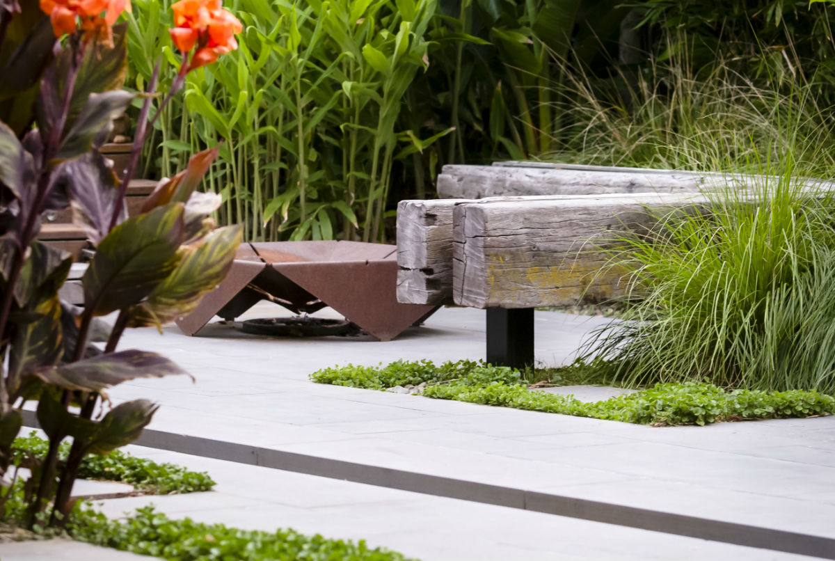 This garden in the Melbourne suburb of Ripponlea was designed by Lisa Ellis Gardens.  The striking foliage, coupled with Stone Hub’s Graphite Sawn Bluestone hardscaping, showcased the architecture of the property and created various zones with a lush resort style feel.  This included a striking water rill cutting through the backyard.